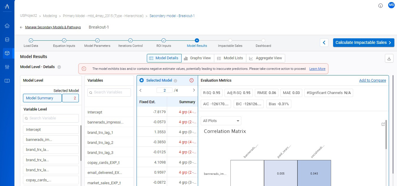 Incorporating statistical bias within the evaluation metric significantly enhances the model reliability. Additionally, a new popup notification alerts users if bias or negative estimate values are detected in the model, offering several corrective actions.